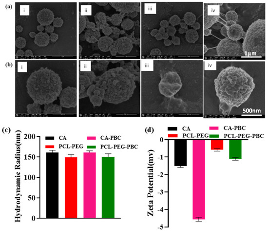 SEM images of fluorescent nanoparticles (i) CA, (ii) CA-PBC, (iii) PCL-PEG, and (iv) PCL-PEG-PBC at (a) 50,000× magnification (Scale bar 1 µm) and (b) 100,000× magnification (Scale bar 500 nm). All the nanoparticles show spherical shapes with an average particle size of ~150 nm. Particle sizes were comparable in both CA, CA-PBC, PCL-PEG, and PCL-PEG-PBC showing porous structure in all the nanoparticles. (c) Particle size analysis of CA, CA-PBC, PCL-PEG, and PCL-PEG-PBC (n = 5). (d) Zeta potential value of CA, CA-PBC, PCL-PEG, and PCL-PEG-PBC dispersed in PBS. Ordinary one-way ANOVA showed statistical difference with p value * = p < 0.0001 for both particle size and zeta potential for each group. The particle size DLS measurements showed the hydrodynamic radius varied between ~150–162 nm. The negative zeta potential of nanoparticles in PBS at pH 7.4 show their stability in suspension and advantage in cell diffusion.