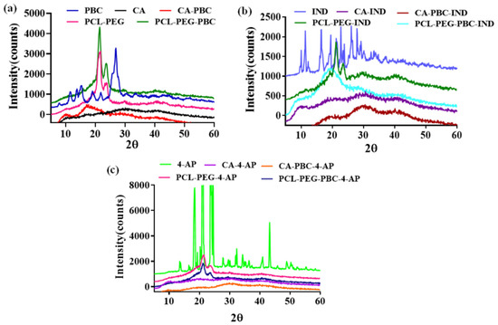 X-ray diffraction (XRD) spectra for (a) PBC, CA, CA-PBC, PCL-PEG, and PCL-PEG-PBC; (b) IND, CA-IND, CA-PBC-IND, PCL-PEG-IND, and PCL-PEG-PBC-IND; and (c) 4-AP, CA-4-AP, CA-PBC-4-AP, PCL-PEG-4-AP, and PCL-PEG-PBC-4AP. XRD was recorded from 5o to 60o (2θ) at a scanning speed of 0.2 deg/s. Cu-Ka radiation at 40 kV and 30 mA was used as the X-ray source. Nanoparticles show no sharp peaks indicating the amorphous nature, whereas the IND and 4-AP show sharp peaks indicating a crystalline nature, and drug-loaded nanoparticles show a diffused peak, indicative of the presence of drug matrix interaction.