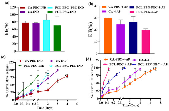 Encapsulation efficiency (EE (%)) of (a) IND and (b) 4-AP. (c) Cumulative release of IND from nanoparticles CA-PBC, CA, PCL-PEG-PBC, and PCL-PEG. The % EE of IND varied from 70 to 85% because of the hydrophobic nature of IND and drug interaction with the polymer carrier, while the % EE for 4-AP was very low and varied from 20 to 30% due to the hydrophilic nature of 4-AP. (d) Cumulative release of 4-AP from nanoparticles CA-PBC, CA, PCL-PEG-PBC, and PCL-PEG (n = 3 samples/group, mean ± s.d.). One-way ANOVA with mixed-effect analysis showed statistical difference with p value * = p < 0.0001 for CA-4AP vs CA-PBC-4-AP, PCL-PEG-4AP vs. PCL-PEG-PBC-4-AP, CA-IND vs CA-PBC-IND and PCL-PEG-IND vs. PCL-PEG-PBC-IND. The release of IND from these nanoparticles continued for up to 4 days, whereas the release of 4-AP lasting up to 7 days was dependent on the carrier and may be due to the hydrophobic modification of CA by conjugation with PBC dye or potential ionic interaction between the dye and matrix functionalities.