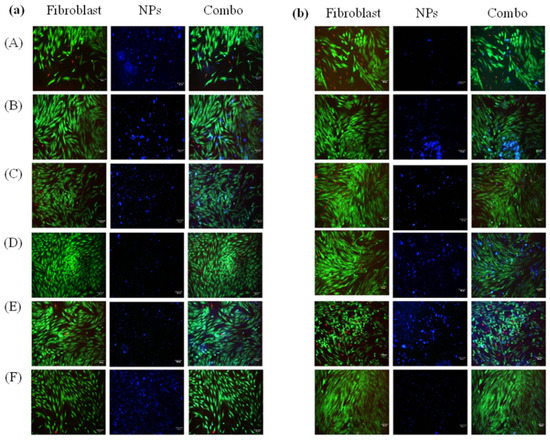 In vitro cell uptake of fluorescent nanoparticles of day 1 (a) and day 3 (b) with 4-AP (10 µg/mL) and IND (50 µg/mL) in drug media solution (n = 5). The left columns of each panel (A,B) show live/dead staining images of fibroblast cells. The middle column shows fluorescent nanoparticles (A) CA-PBC, (B) CA-PBC-IND, (C) CA-PBC-4-AP, (D) PCL-PEG-PBC, (E) PCL-PEG-PBC-IND, and (F) PCL-PEG-PBC-4-AP. The right columns for each panel (a,b) show combined (Combo) images. The layover images show the presence of nanoparticles taken by the cells as well as in the culture media. The fibroblast cells maintained morphology with no evident cell death by the nanoparticle addition from Day 1. Day 3 shows some cell death for CA-PBC-IND compared to CA-PBC-4-AP (scale bar 100 µm).