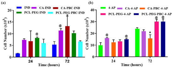 Cell proliferation (MTS assay) of fibroblast cells with drug alone (control groups: IND or 4-AP) or fluorescent nanoparticles with (a) IND (50 µg /mL), or (b) 4-AP (10 µg/mL) in drug media solution at 3 days. @ = p < 0.001 vs. respective control 4-AP, and * = p < 0.0001 vs. respective control n = 5. Two-way ANOVA with Tukey’s multiple comparisons showed: day 1 PCL-PEG-IND vs. IND (p < 0.001); day 3 CA-IND vs. IND (p < 0.001); CA-PBC-IND vs. IND (p < 0.001); day 1 CA-4-AP vs. 4-AP (p < 0.001); PCL-PEG-PBC-4-AP vs. 4-AP (p < 0.001); day 3 CA-PBC-4-AP vs. 4-AP (p < 0.0001); PCL-PEG-4-AP vs. 4AP (p < 0.001); and PCL-PEG-PBC-4-AP vs. 4-AP (p < 0.001). The nanoparticle uptake by fibroblasts and their viability over 3 days in culture indicate the non-toxic nature of the nanoparticles.