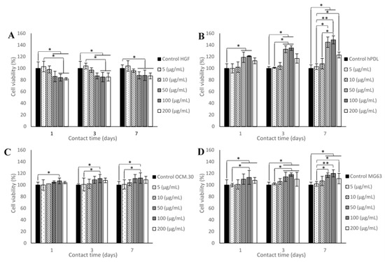 The results of cell metabolic activity, comparing the different concentrations of ADP-5 on the four periodontal cell types, are shown in Figure 2. A slight and significant decrease in cell viability was observed for HGF cells from the concentration of 50 μg/mL, whatever the contact time point (1, 3, and 7 days), compared to control cells. For the other three cell types (hPDL, OCM.30, and MG63), a cell viability significant enhancement was observed from day 1 of incubation with 50 μg/mL ADP-5 for MG63 and hPDL and 100 μg/mL ADP-5 for OCM.30 cells. hPDL cell viability revealed a significant enhancement at the concentrations of 50 μg/mL and 100 μg/mL; for OCM.30, a significant enhancement in cell viability was only observed at 100 μg/mL ADP-5; for MG63, the three concentrations (50 μg/mL, 100 μg/mL, and 200 μg/mL ADP-5) induced a significant enhancement in cell viability versus control cells.