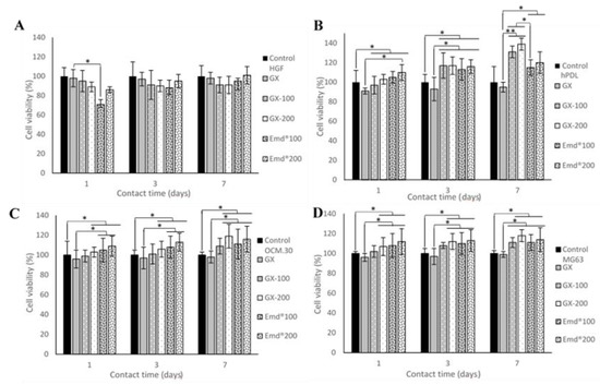 Cell metabolic activity expressed as viability rate (%) as function of the tested gel groups and the contact time: (A) human gingival fibroblast (HGF) cells; (B) human periodontal ligament (hPDL) cells; (C) cementoblast (OCM.30); (D) osteoblast (MG63) cells. Data are mean ± SD of 3 independent experiments (n = 9/group). * p < 0.05 and ** p < 0.001 denote significant differences.