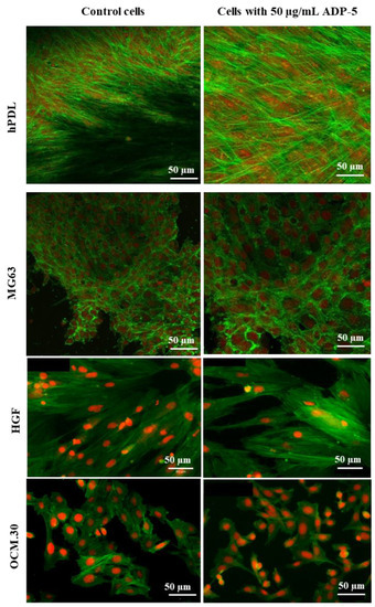 Representative images of hPDL, MG63, HGF, and OCM.30 cells’ morphology by confocal microscopy: control cells; cells in contact of 50 µg/mL of ADP-5. Cytoskeletal F-actin is stained green with Alexa Fluor™ 488 Phalloidin and cell nuclei are stained red with propidium iodide. Scale bar = 50 µm.