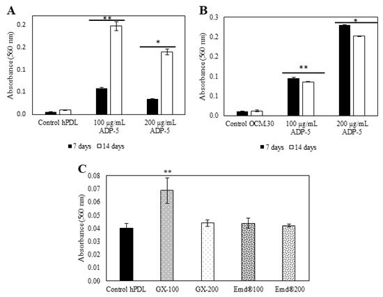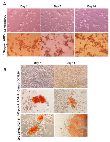 Alizarin red staining (ARS) was used to assess matrix mineralization. In the first step of the investigation, the ARS assay was carried out following the contact of ADP-5 alone, at the concentration of 100 µg/mL and 200 µg/mL, after 7 and 14 days for both hPDL and OCM.30 cells. In the second part of the investigation, hPDL cells were subjected to 100 µg/mL and 200 µg/mL GX-ADP-5 or Emdogain® (100 µg/mL and 200 µg/mL). The culture media were changed every 3 to 4 days.