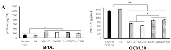 ELISA assays were used on hPDL and OCM.30 cells to quantify the production of three inflammatory mediators: a growth factor, vascular endothelial growth factor A (VEGF-A), and two inflammatory cytokines, tumor necrosis factor alpha (TNF-α) and interleukin 11 (IL-11), involved in inflammatory reaction periodontitis [24,25]. These assays were made at 3 days following direct contact of each two-cell types with GX, GX-100, GX-200, Emd®100, and Emd®200. All cell lysates were subjected to ELISA for inflammatory mediators by applying ELISA kits: human (for hPDL) and mouse (for OCM.30) VEGF-A (KHG011, ThermoFisher Scientific), TNF-α (BMS223HS, ThermoFisher Scientific, France), and IL-11 (human EHIL11 and mouse EMIL11, ThermoFisher Scientific, France). Each ELISA was performed according to the manufacturer’s instruction. The experiment was performed in triplicate and repeated three times (n = 9); the data were compared to a standard curve. Absorption measurements were performed at 450 nm (Nanoquant infinite M200 pro, Tecan group Ltd., Lyon, France).