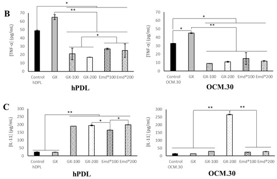 Rate of inflammation mediators production by ELISA after 3 days of cells’ contact with GX containing or not ADP-5 and EMD: protein rate of VEGF-A factor (A), TNF-α (B), and IL-11 (C) by hPDL (left side) and OCM.30 (right side) cells. Data are mean value of 3 independent experiments (n = 12/group). * p < 0.05 and ** p < 0.001 denote a significant difference.