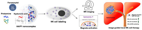The adoptive transfer of NK cells is a component of NK cell immunotherapy, which is gaining more attention as a possible immunotherapy for the treatment of a variety of diseases. Importantly, in contrast to many competing cytotoxic T lymphocyte therapies, NK cells may specifically destroy tumor cells without prior exposure to tumor-specific antigens. However, the success of the therapy is frequently only moderate in solid tumors that have already developed. To generate significant numbers of functional NK cells for cancer treatment, the ex vivo activation of NK cells with exogenous cytokines is commonly required but ineffective. Another option for treatment is the local delivery of NK cells under image guidance. There are not enough non-invasive methods to keep track of NK cells. To improve the therapeutic effectiveness of NK cells for solid tumors, Sim et al. created nanocomplexes (HAPF) made of therapeutically relevant materials (hyaluronic acid, protamine, and ferumoxytol) to enable the magneto-activation and MRI visibility of NK cells (Figure 3) [84]. In NK cells, an enhanced self-assembled HAPF nanocomplex was successfully bound and tagged. An exogenic AC magnetic field application could activate HAPF-labeled NK cells to improve their innate cytolytic capability. Actin filaments and NKG2D receptors, which are unique to NK cells, were activated. Then, as a result of the elevation of the NK cell activation markers Perf/Gzmb and NKG2D activation receptors, the cytolytic potential was enhanced. Additionally, MRI-visible HAPF-NK cells allowed for NK cells to be monitored after transcatheter hepatic intra-arterial local NK cell administration. In an HCC rat model, it was demonstrated that locally injected HAPF-NK cells, activated by a magnetic field, have potential therapeutic effects by slowing the development of solid tumors.