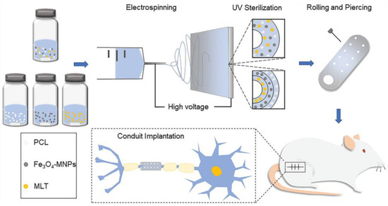 For instance, by stimulating the signaling pathway for the mitogen-activated protein kinase, Fe3O4 nanoparticles can also promote neurite development. The ability to use nanoparticles to improve the mechanical characteristics of the nerve guiding conduit (NGC) has also been demonstrated in earlier research, which is even more significant. Chen et al. created a multilayered composite NGC (ML-NGC), loaded with melatonin (MLT) and Fe3O4 by electrospinning it (Figure 4) [94]. With MLT minimizing oxidative damage and Fe3O4 promoting neurite renewal, this three-layer scaffold is thought to offer enough mechanical strength for neurite sprouting; it will, therefore, establish the ideal milieu for nerve regeneration.