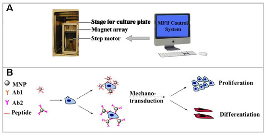 Magnetic nanoparticles can produce mechanical effects in gradient or rotating magnetic fields. The “nano-magnetic force” can be used to regulate cell function and fate, such as damage to the cell membrane system or cytoskeleton, resulting in the apoptosis or necrosis of cells; it can also be used to promote stem cell differentiation and the formation of functional tissues. For instance, a magnetic force bioreactor (MFB) was created by Hu et al. and uses magnetic micro- and nano-particles to target cell surface receptors to apply highly tailored local stresses to cells at a pico-newton level (Figure 5) [106]. The MFB system consists of horizontal arrays of NdFeB magnets, onto which cell culture plates can be situated. The frequency and amplitude of the oscillations of the array are controlled via a computerized stepper motor system. The field strength produced by the magnetic arrays of the MFB in the vicinity of the cells is in the region of 60–120 mT, with a field gradient of 3.3–11.0 Tm−1. The findings demonstrated that human bone-marrow-derived mesenchymal stem cells (hMSCs) greatly improved osteogenic differentiation via magneto-mechanical stimulation, mediated by MNPs.