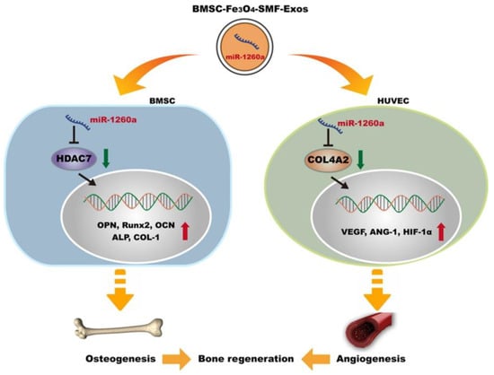 With or without SMFs, magnetic nanoparticles can stimulate angiogenesis and osteogenesis. According to earlier research, Exos, produced by bone marrow mesenchymal stem cells (BMSCs), have therapeutic effects that are like those of BMSCs in treating bone regeneration; they deliver Exos and seldom trigger strong immune reactions. The most significant finding was that BMSC-Exos, cultivated under magnetic conditions, also improved wound healing. Therefore, Wu et al. demonstrated that Exos derived from BMSCs, pretreated with magnetic fields or low-dose magnetic nanoparticles, can promote osteogenesis and angiogenesis during bone regeneration (Figure 6) [116]. Among them, it was shown in both in vivo and in vitro experiments that the BMSC-Fe3O4-SMF-Exos, produced after the combined pretreatment of magnetic fields and magnetic nanoparticles with mesenchymal stem cells, had the most significant osteogenesis and angiogenesis effects. This promoting effect is related to the high abundance of miR-1260a in BMSC-Fe3O4-SMF-Exos. In addition, some other experimental results have shown that a plasmid that overexpresses HDAC7 in BMSC and a plasmid that overexpresses COL4A2 in HUVEC could abolish the promoting effect of exosomal miR-1260a mimics on osteogenesis and angiogenesis. The overexpression of HDAC7 rescued osteogenic activity, the overexpression of COL4A2 rescued angiogenic activity, and both were enhanced by miR-1260a mimics. They concluded that exosomal miR-1260a, derived from BMSC-Fe3O4-SMF-Exos, promoted osteogenesis by targeting HDAC7 and that it promoted angiogenesis by targeting COL4A2.