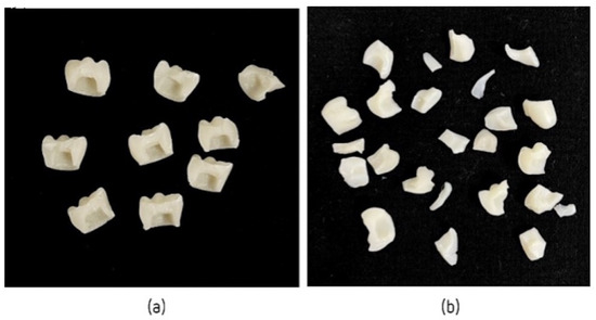 - Mendes, J.M.; Botelho, P.C.; Mendes, J.; Barreiros, P.; Aroso, C.; Silva, A.S. Comparison of Fracture Strengths of Three Provisional Prosthodontic CAD/CAM Materials: Laboratory Fatigue Tests. Appl. Sci. 2021, 11, 9589. [Google Scholar] [CrossRef]