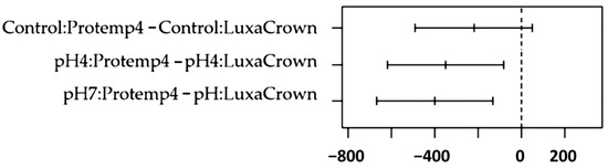 | Crowns | Control | pH 4 | pH 7 | Subtotal Crowns | ANOVA * pH | ANOVA ** Crowns × pH |