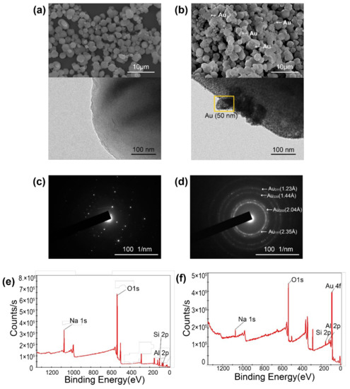 Microstructures and properties of Au-decorated zeolite. (a) SEM (top) and TEM images of zeolite, (b) TEM and SEM images of Au-decorated zeolite, (c) diffraction pattern of zeolite, (d) Au-decorated zeolite, (e) XPS of zeolite, and (f) XPS of Au-decorated zeolite.