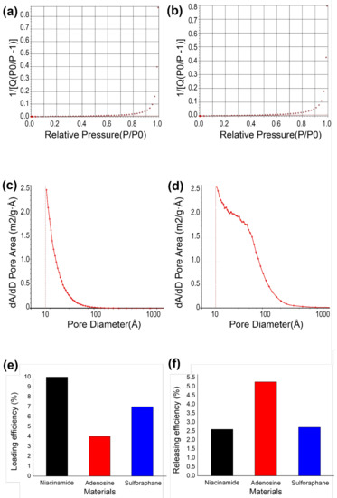 Pore-size distribution and entrapment/delivery efficiency of Au-decorated zeolite. (a) BET surface area of zeolite and (b) Au-decorated zeolite, (c) pore-size distribution of zeolite and (d) Au-decorated zeolite, (e) drug-loading efficiency, and (f) releasing efficiency.