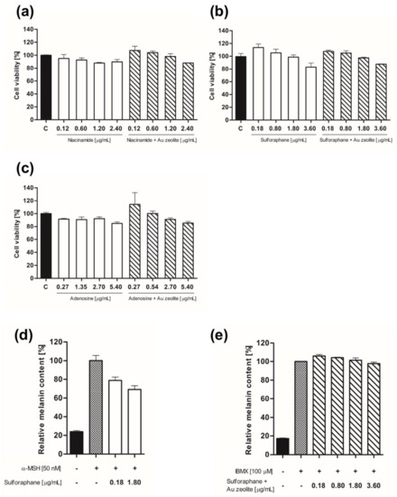 In vitro cell viability and activity of the biocompatible nanocomposite, Au zeolite, cosmetic drug delivery system. (a) B16F10 cell viability of niacinamide and niacinamide + Au zeolite, (b) sulforaphane and sulforaphane + Au zeolite, and (c) adenosine and adenosine + Au zeolite. (d) Relative melanin content of (d) sulforaphane and (e) sulforaphane + Au zeolite.