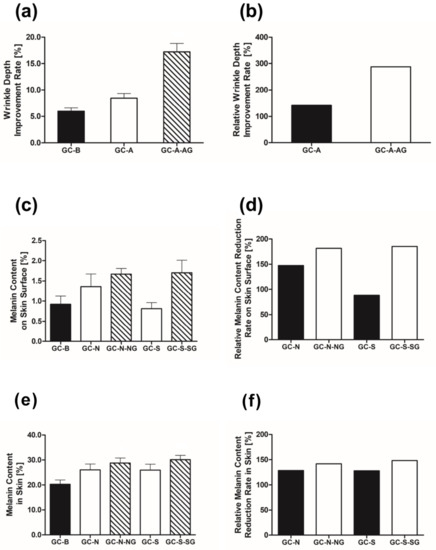 (a) Effects of GC-A, GC-A-AG vs. GC-B (control) on wrinkle depth (b) effects of GC-A and GC-A-AG on wrinkle depth; (c) effects of GC-N and GC-N-NG on melanin on the skin surface; (d) GC-N, GC-N-NG vs. GC-B, (e) effects of GC-S and GC-S-SG on the melanin on skin; and (f) GC-S, GC-S-SG vs. GC-B.