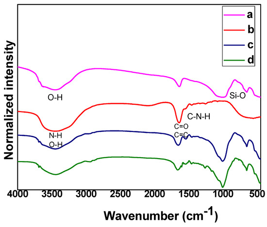 FTIR spectra (a) Lap; (b) GelMA; (c) Lap/GelMA hydrogel and (d) Lap/GelMA/IG (hydrogel with Igarcure 2959).