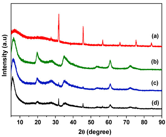 The XRD patterns are shown in Figure 3. For GelMA (Figure 3 (a)), six main reflections were detected. The highest intensity reflection was observed at 2θ = 32° and also reflections at 46, 57, 67, 75 and 84° that were attributed to the polymer network [5,6,7,8]. For the Lap sample (Figure 3 (b)), the first reflection at 2θ = 6.5° (001 reflection) was associated with basal spacing of 1.36 nm, which is characteristic of Lap. Additional reflections were also observed at 20°, 29°, 35°, 55°, and 61° [18]. The reflection associated with 060 reflection occurred above 60° and it is indicative of a trioctahedral clay sample, characteristic of Lap. For the GelMA hydrogel (with or without iguarcure—Figure 3 (c,d)), the XRD patterns showed similarity with the Lap sample and the presence of two broad reflections of GelMA. The Lap/GelMA (Figure 3 (c,d)) hydrogels, 001 reflection associated with Lap phase shifted from 6.5° to 6.15°, corresponding to a basal spacing of 1.44 nm, indicating the presence of GelMA polymeric chains in the interlayer space of the clay mineral [18].