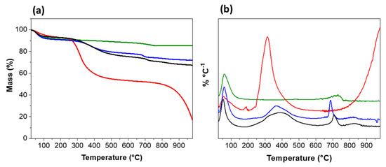 (a) TG/DTG and (b) derivative (DTG) curves of GelMA (red line); Lap (green line); hydrogel GelMA/Lap (blue line); hydrogel GelMA/Lap/Ig (black line).