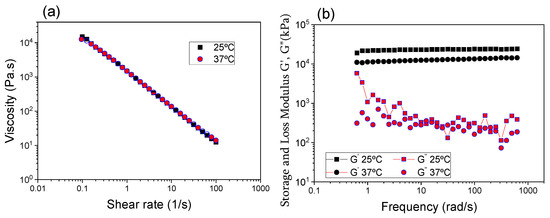 Rheological analysis of the Lap/GelMA hydrogel: (a) viscosity as a function of shear rate; (b) storage modules (G’) and loss module (G”).
