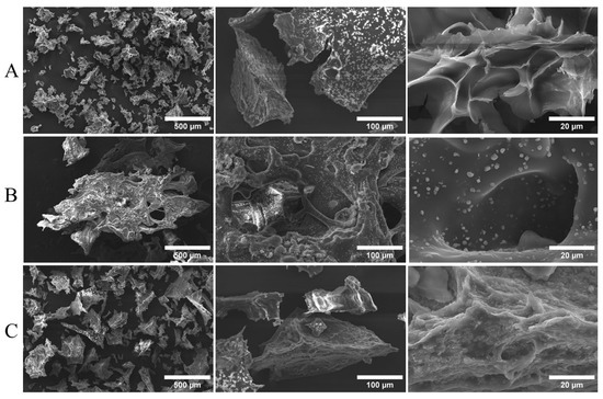 SEM images for (A) Lap 6%; (B) GelMA 1%; (C) Hydrogel Lap/GelMA.