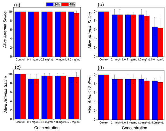 Artemia salina lethality assay—(a) Lap; (b) GelMA; (c) Lap/GelMA hydrogel; (d) Lap/GelMA hydrogel (with igarcure). The control group were compared to the other groups, with a statistically significant difference for p ≤ 0.05.