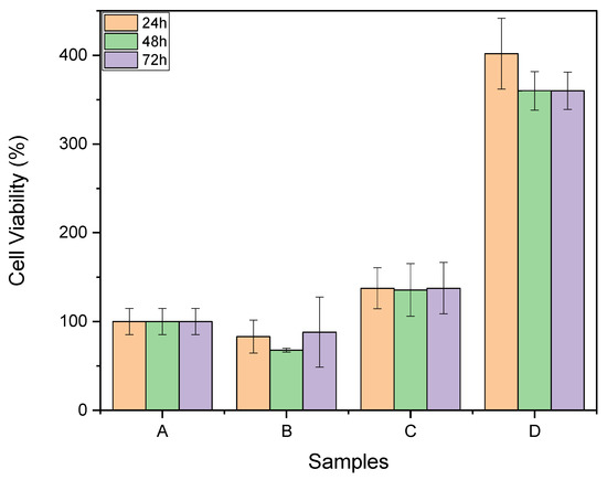 Cell viability tests by MTT at different times (24, 48 and 72 h) for samples: (A) Control; (B) GelMA; (C) Lap; (D) Hydrogel Lap/GelMA (with Iguarcure). The control groups were compared to the other groups, with a statistically significant difference for p ≤ 0.05.