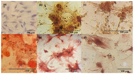 Osteogenic differentiation assessment by Alizarin Red: (a) undifferentiated stem cells; (b) Osteoblasts after 21 days of treatment in contact with the hydrogel Lap and stained with Alizarin Red; (c) Osteoblasts after 21 days of treatment in specific media and contact with the hydrogel Lap and stained with Alizarin Red; (d) Osteoblasts after 21 days of treatment in specific media and contact with the hydrogel GelMA and stained with Alizarin Red; (e) Osteoblasts after 21 days of treatment in contact with the hydrogel Lap/GelMA and stained with Alizarin Red; (f) Osteoblasts after 21 days of treatment in specific media and contact with the hydrogel Lap/GelMA and stained with Alizarin Red.