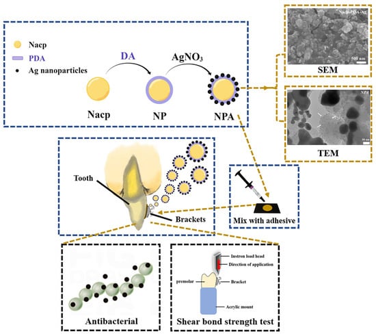 Schematic of the synthesis process of the NPA fillers and orthodontic adhesive containing NPA fillers with both antibacterial properties and a reasonable shear bond strength.