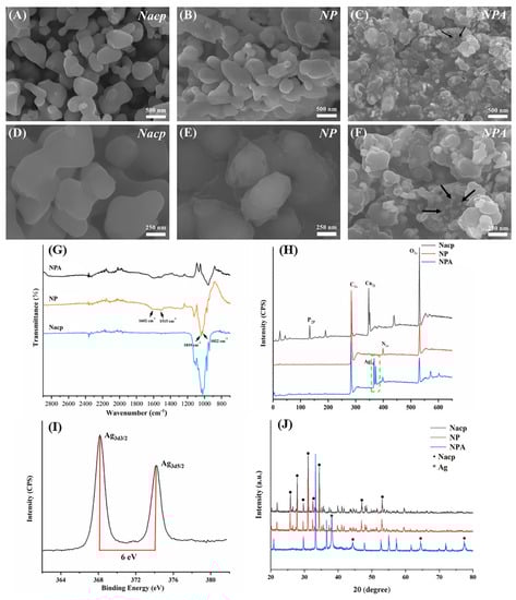 The characterization of Nacp, NP, and NPA with SEM (A−F), FTIR (G), XPS (H,I), and XRD (J). Figure (I) shows a magnification of the Ag signals in Figure (H) (the black arrows in Figure (C,F) indicate Ag nanoparticles).
