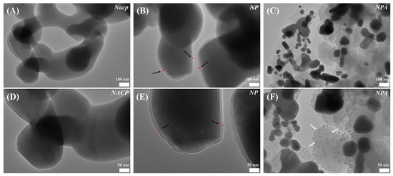 The characterization of Nacp, NP, and NPA using TEM (A–F). (The white arrows in Figure (F) indicate Ag nanoparticles.)