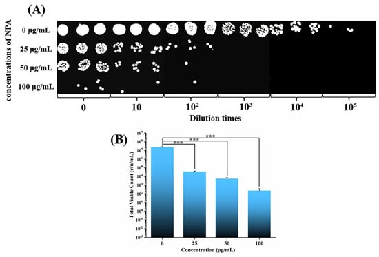 The outcomes of the NPA nanoparticles’ antibacterial test utilizing the film method. (A) Images of typical bacterial colonies of S. mutans following cocultivation with various concentrations of NPA nanoparticles. (B) Measurable outcomes connected with the bacterial quantities of S. mutans (*** represents p < 0.001).