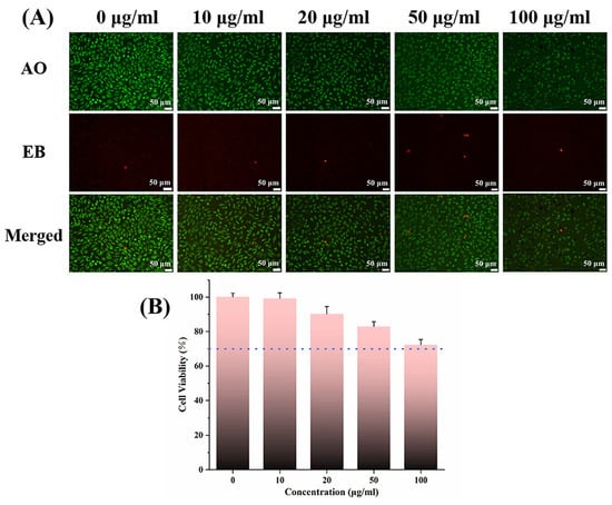 Cytotoxicity tests can effectively examine the biocompatibility of sample materials and lay the foundation for in vivo experiments. L929 cells have been used in this study for better sensitivity. Figure 5 shows the images obtained following AO/EB double staining after L929 cells were inoculated and co-cultured with different concentrations of NP nanoparticles for 24 h under a fluorescent microscope. Acridine orange (AO) can enter the nucleus of living cells and emit green fluorescence, while ethidium bromide (EB) can only enter the nucleus of apoptotic cells and emit red fluorescence. A large number of green cells with a normal morphology appeared in the images after five subgroups (0 μg/mL, 10 μg/mL, 20 μg/mL, 50 μg/mL, and 100 μg/mL) were stained with AO, while few red apoptotic cells were stained with EB. The blue dashed line represents a cell survival greater than 70% for all concentrations of NP (Figure 5B), meeting the International Standards Organization (ISO) requirements for material biocompatibility [27]. A small number of Ag nanoparticles are not toxic to fibroblasts and can maintain a good antibacterial effect [28]. Moreover, compounds with catechol structures such as PDA can reduce the toxicity of Ag nanoparticles. In addition, intraoral saliva flushing will reduce the concentration of Ag+ and toxicity, so the material may have fewer adverse effects on cells when applied to an oral environment with food, drink, and salivary stream washout.
