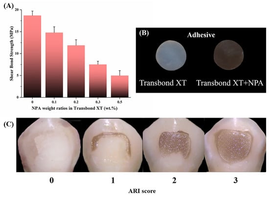 (A) Shear bond strength test results of the adhesive with varying proportions of NPA. (B) Resin blocks with or without NPA (Transbond XT and Transbond XT+NPA). (C) ARI scoring criteria.