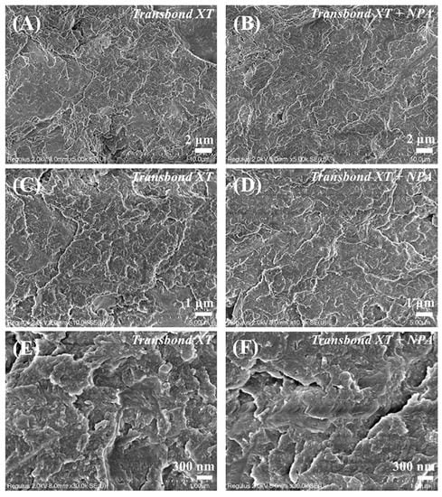 Images of the adhesive observed using SEM. Figure (A) corresponds to Transbond XT. Figure (B) corresponds to Transbond XT+NPA. (C,E) and (D,F) are the magnified views of (A,B).