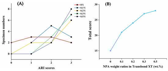 The ARI scores reflect the adhesive residue on the enamel surface and can assist in detecting the shear bond strength. There are three types of adhesive fracture between the enamel and the bracket following bracket detachment. First, the adhesive fractures between the enamel and the resin. Second, the adhesive breaks inside the resin. Third, the adhesive breaks between the bracket and the resin. Although the residual adhesive on the tooth surface needs to be removed clinically for the second and third types of adhesive fracture, it is less likely to damage the enamel and is more in line with the concept of health in orthodontic treatment. The first type of adhesive fracture should be avoided whenever possible to minimize the damage to the enamel. The ARI scores in Figure 6A show that the scores of Transbond XT + 0 wt.% NPA were evenly distributed, while the number of bonded specimens with scores of 2 and 3 increased as the NPA content increased. Significantly, the total ARI scores and the adhesive residual on the enamel surface increased with the NPA fillers content increase (Figure 8B), indicating that the addition of fillers may affect the fracture type, with a shift from the first to the second and third types. Collectively, our findings reveal that the addition of fillers is beneficial in the protection of the enamel surface during bracket removal.