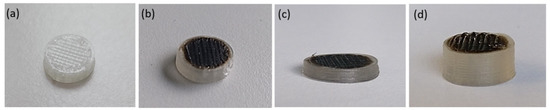 The 3D-printed PLA discs, which are 2.85 mm thick, are drop-coated with 0.00 mg of GO (a), with 0.10 mg of GO (b); 3D-printed PLA discs of 2.20 mm thick (c), and 5.60 mm thick (d), are drop-coated with 0.10 mg of GO.