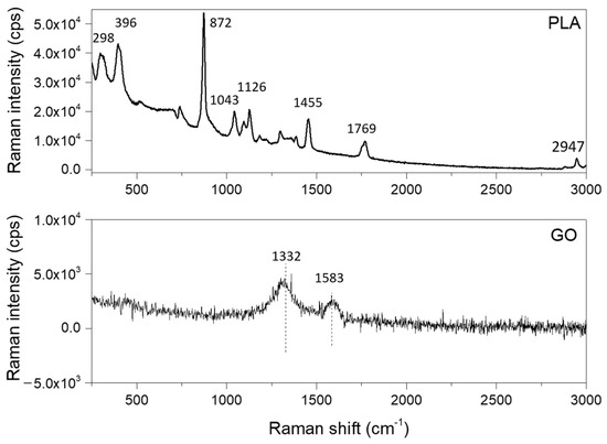 The GO-PLA probes were characterized by Fourier Transform (FT) Raman spectroscopy to identify the main molecular vibrations and, subsequently, assign the corresponding chemical bonds. For this test, a B&WTEK i-Raman-785S instrument equipped with a BAC 100 probe (785 nm) through a 10× magnification objective was used at a resolution of 2 cm−1 to take 32 scans with incident laser radiation, maintained to generate 100 mW. The spectra obtained from both faces of the GO-PLA probes are shown in Figure 2. The FT-Raman spectrum obtained for the face with the GO coating revealed the typical G-band centered at 1583 cm−1 and a D-band centered at 1332 cm−1. The associated positions agree with previous works on the identification of nanosheets from GO [24]. The FT-Raman spectra for the bottom face of the 3D-printed PLA revealed the expected intense and sharp band at 872 cm−1, attributed to C-COO stretching, and others at 298 cm−1 and 396 cm−1, attributed, respectively, to the bending of C-O-C and C-CO; 1043 cm−1 was attributed to skeletal stretching in C-CH3; 1126 cm−1 was attributed to asymmetric rocking CH3; 1455 cm−1 was attributed to the symmetric bending of CH3; 1769 cm−1 was attributed to C=O asymmetric stretching; and, finally, 2947 cm−1 was attributed to CH3 symmetric stretching. In the same way, the positions for the different peaks were in line with previous works with 3D-printed PLA [25].