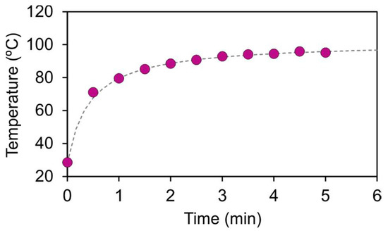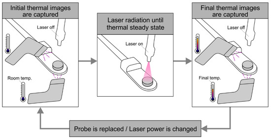 - The laser was switched on and the power of the laser was set to 32.73 mW. The probe was heated until a stationary state was reached. The evolution of the temperature was captured periodically with both cameras. As shown in Figure 5 for a representative case, the stabilization time was approximately 5 min.