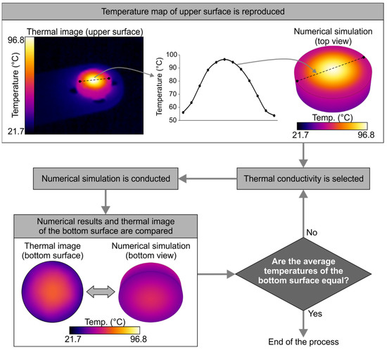 In line with previous studies [26,27] to determine the specific thermal conductivity of the probes, a series of steady-state numerical simulations, fed with the experimental data obtained from the thermal images, was carried out using the ANSYS Workbench (by ANSYS Inc., Canonsburg, PA, USA) software. The process is shown in Figure 6 and can be described as follows: