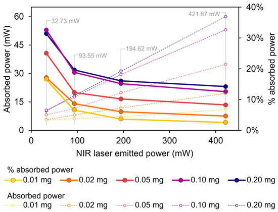 Graph of the total absorbed power (left axis) and the percentage of absorbed power with respect to the total emitted power (right axis) vs the NIR laser emitted power (horizontal axis).