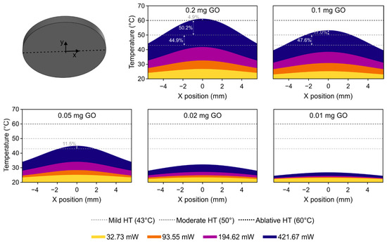 The graphs for 0.01 and 0.02 mg of GO indicate that no hyperthermia is reached for any of the tested laser powers. In the case of the probe with 0.05 mg of GO, a mild level of hyperthermia is obtained when the power is at the maximum, but only in a small region (11.5%) in the center of the surface. For 0.1 mg of GO and 421.64 mW of power, the temperature in the central region is above the level of moderate hyperthermia, and 47.6% of the entire surface is under conditions of mild hyperthermia. Finally, considering the maximum power conditions, the probe with 0.2 mg of GO reaches ablative hyperthermia at the center point, a moderate level in more than 50% of the total surface, and mild hyperthermia over the rest of the surface.