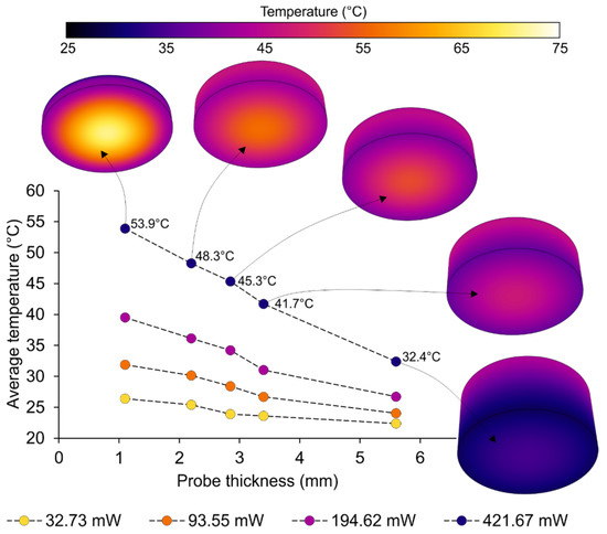The graph shows the expected decrease in temperature with the increase in probe thickness. Because of the thermal conduction across the material and the larger lateral surface area that is subjected to natural convection, the thickness of the probe is inversely proportional to the average temperature of the bottom surface of the probe. The reduction in the bottom surface temperature is more pronounced for those examples exposed to the higher laser power, where the average temperature of the surface ranges from 53.9 °C for a probe thickness of 1.10 mm, to 32.4 °C for a probe thickness of 5.60 mm.