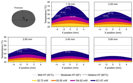 To evaluate the level of hyperthermia reached on the surface that will be in contact with the affected tissue, the graphs in Figure 11 show the profile of the temperature readings on the bottom surface of the probe, also representing the area of this surface that is above each level of hyperthermia (mild, moderate, and ablative) for the different probe thicknesses and the emitted powers.