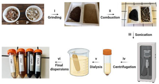 Synthetic process for C-dot production: (i) C and P shells were ground into fine powder, (ii) combustion, (iii) tip sonication, (iv) centrifugation, (v) dialysis, (vi) and final dispersions.