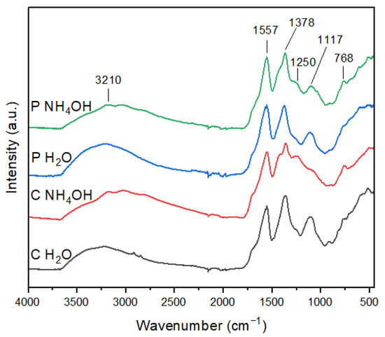 The FT-IR spectra of the C-dot samples are shown in Figure 2. The C-dots prepared in H2O have similar spectra and show four main peaks at 3210, 1557, 1378, and 1117 cm−1 [31]. In particular, the presence of the carboxyl group was confirmed by the characteristic absorption band of O–H at 3210 cm−1 and the stretching vibration band of C–O at 1117 cm−1 [32]. The sharp peak at 1557 cm−1 can be ascribed to C=O bond stretching, thus indicating the existence of carbonyl groups. Furthermore, the peak at 1378 cm−1 is associated with the bending vibrations of C=C, suggesting the presence of aryl groups [33]. The FT-IR spectra of the C-dots prepared in NH4OH show two additional peaks at 1250 and 768 cm−1, in comparison to the ones in H2O. The peak at 1250 cm−1 can be attributed to the C-O stretching of an epoxy/ether group, while the one at 768 cm−1 could be ascribed either to C=C or C-H bending, suggesting that in the presence of ammonia, C-dots have a more graphitic composition. Moreover, the absorption band at 1117 cm−1 is weakened for the C-dots prepared in NH4OH, especially in the case of C NH4OH, thus indicating a lesser abundance of carboxyl moieties in these samples.