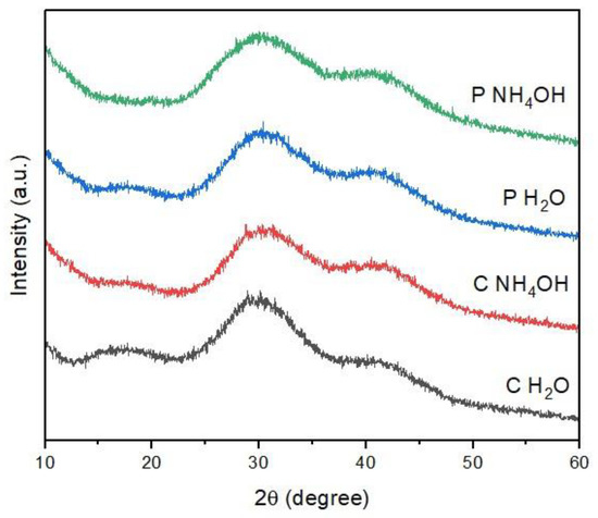 The PXRD pattern of C-dots is reported in Figure 3. For all the samples, only a broad band at 30° 2θ is observed, which is characteristic of an amorphous carbon phase [21,22]. This result is also in agreement with the TEM analysis. Moreover, this outcome is in line with previous results, as it is widely reported in the literature that C-dots synthesized from both natural and synthetic carbon sources commonly have an amorphous structure [22,31,34,35]. In the case of the PXRD data, there are no marked differences between the samples, neither on the basis of the source material nor of the dispersion solvent.