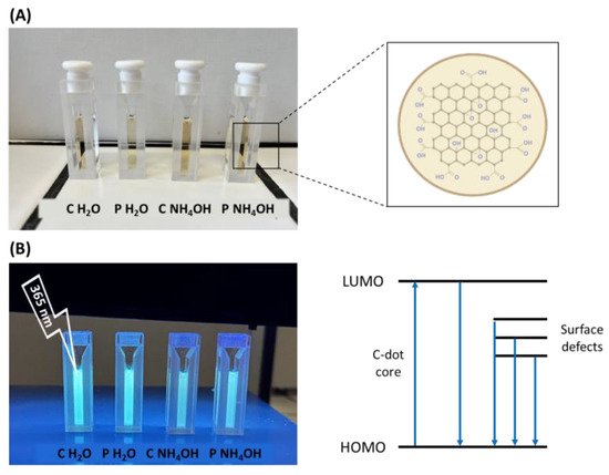 Moreover, the difference in size between C H2O/P H2O and C NH4OH/P NH4OH could also explain their spectral differences because of quantum confinement effects [40,41]. According to the quantum confinement effect, the absorption spectrum is shifted to lower wavelengths as the particle becomes smaller, which is in agreement with the particle size results. However, it must be mentioned that the correlation between C-dots’ photophysical properties and the quantum confinement effect has not always been confirmed in the literature, and, thus, the optical properties of C-dots might be mainly related to their surface states [42].