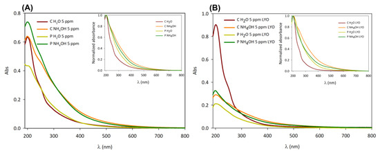 Absorption spectra of chestnut (C H2O and C NH4OH) and peanut (P H2O and P NH4OH) native dispersion (A) and freeze-dried (B) samples. Inset: normalized absorption spectra of native dispersion (A) and freeze-dried (B) samples.